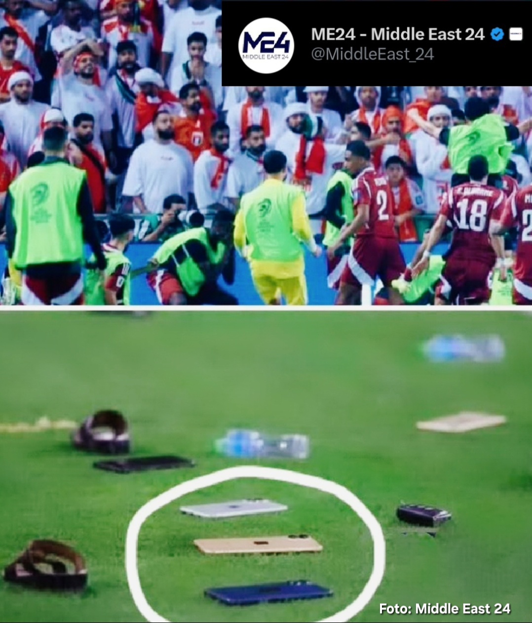 “Insiden saling lempar perangkat iPhone 17 Pro Max antar suporter Qatar dan UEA setelah Gatar menang dan lolos ke Piala Dunia telah memicu kecaman dan kritik luas di dunia Arab,” tulis Middle East 24.