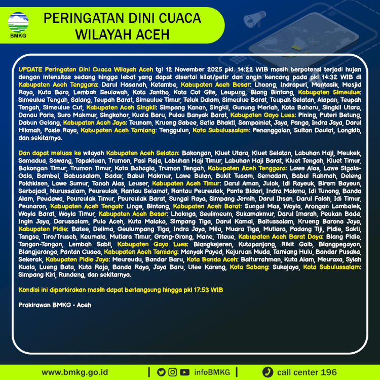 Seperti yang terlihat di BMKG Peringatan dini cuaca di wilayah Aceh, khususnya Kabupaten Aceh Tengah, pada rabu 12 November 2025, masih berpotensi hujan dengan intensitas sedang hingan lebat yang dapat di sertai Kilat/Petir, dan angin kencang, Hujan dengan Intensitas sedang hingan lebat di diperkirakan masih akan berlangsung hingga 17.53 WIb. sehingga BMKG Aceh terus memantau situasi dan memberikan update perkembangan perkiraan cuaca.